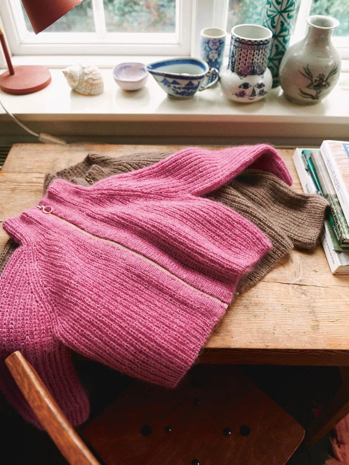 Oppskrift til Tia Zipper jacket junior i Tynn Merinoull og Tynn Silk Mohair medfølger.